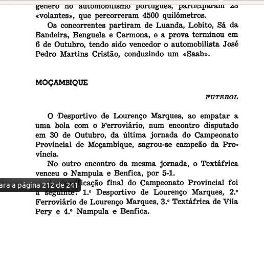 "No topo, depois da Primeira Volta, encontra-se Textafrica, Campeao de Manica e Sofala, um dos grandes favoritos da prova.. E certo que os beirenses tem agora duas partidas dificieis em Lourenco Marques, mas a verdade e que poucos acreditavam no seu triumfo em Nampula, frente ao Benfica que nesta cidade impos um justo empate ao Ferroviario.